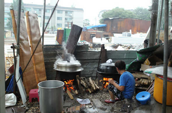 | » 지난 8월12일 새벽 강남구청 직원과 철거용역 140여 명이 서울 강남 포이동 재건마을에 난입했다. 6월 화재 뒤 노인가구를 위해 만든 가건물은 그들의 손에 의해 흔적도 없이 사라졌다. 8월17일 마을회관에서는 마을 주민들을 위한 식사 준비가 한창이었다. 그 너머로 폐허가 된 재건마을의 빈터가 보인다. 한겨레21 이종찬 선임기자 | | | |