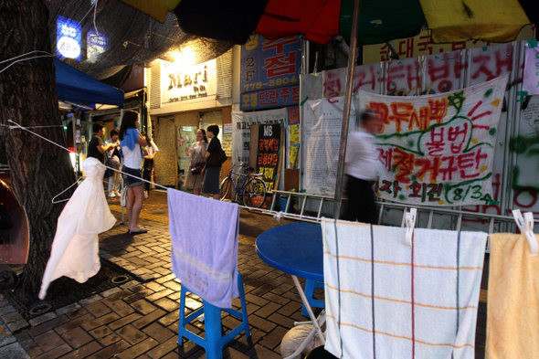 쌀이 떨어져간다. 20kg 8포대가 전부다. 11가구의 세입자를 포함한 40여 명만으로도 8월을 넘기기 빠듯하지만, 수백 명이 다녀가는 주말을 생각하면 한 주 견디기도 녹록지 않다. '명동 마리', '카페 마리'라고도 불리는 곳. "명동해방전선"이라는 펼침막으로 존재를 알리는 서울 명동재개발 3구역이다. 지난 8월3일 새벽 용역들은 농성자만을 몰아낸 것이 아니었다. 쌀을 휘저어 바닥에 흩뿌렸다. "정말 치사했다." 지난 8월17일 만난 이재성(46) 상가대책위 조직부장은 지난해까지 황소식당 사장님이었다. 이 부장은 새벽에 벌어진 용역들의 폭력을 생각하면 아직도 분하고 무섭다. 배재훈 상가대책위 위원장과 농성자 1명이 병원에 입원하고, 20여 명이 통원치료를 요하는 부상을 입었다. 100여 명이 넘는 철거용역이 소화기와 파스를 뿌려대며 들이닥쳤던 그 새벽, 중구청의 중재로 시행사와 대책위 사이에 협상이 진행되고 있어 농성자들은 안심하고 있었다. 구청장이 있는 자리에서 한 시행사 쪽이 밝힌 "철거는 당분간 없다"는 말이 명동 마리의 전 주인인 설순임(42)씨의 귀에 아직도 생생하다. 더 이상 철거와 관련된 어떤 약속도 신뢰하기 힘들다. "명동 마리를 (철거)용역 사무실로 쓰기 위해서"가 철거에 나선 용역회사가 밝힌 이유다.