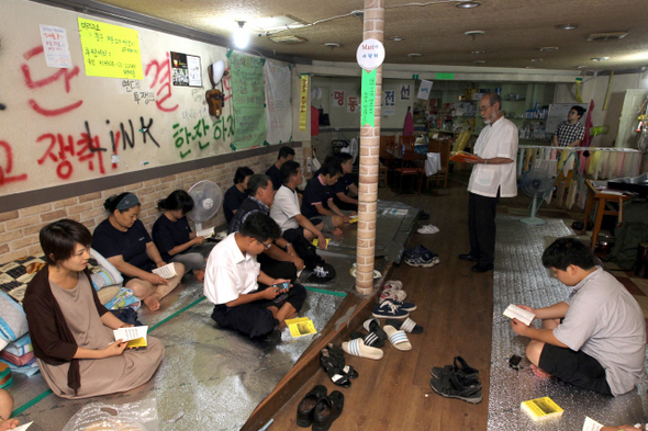 개발이익의 1만분의 1이라도 그날 저녁 7시30분, 매주 열리는 수요예배가 시작됐다. "절에 다니신다고 했던 분은 하느님 대신에 부처님이라고 하셔도 좋습니다." 예전과 달리 숙연함이 더해졌다. 배재훈 대책위원장이 지난 8월4일 철거용역의 폭행으로 몸져누운 지 일주일이 지났지만 여전히 자리보전하고 있다. 앞으로 한 달간은 명동 마리를 지키던 이전의 모습을 보기는 힘들다. 이날 참석한 세입자는 7가구. 배 위원장은 부상으로 요양 중이고, 나머지 3가구는 비번을 받아 집에 갔다. 이틀에 한 번 2~3가구가 순번을 타서 집에 다녀온다.